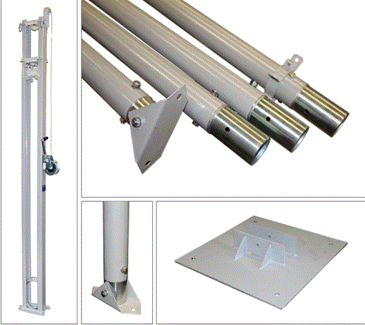 Мачты составные стальные серии МС-С модель МС-С-20 состоят из секций, изготовленных из круглых стальных труб 2 м длиной одинакового диаметра и толщиной стенки (76х1,5 мм), которые соединены между собой с помощью стопорных болтов, пружинных шайб и гаек, что облегчает процесс развертывания. Цвет отличный от "серый металлик" (RAL 9006) + 12% к цене мачты. Максимальная допустимая нагрузка для данной модели составляет 27 кг.